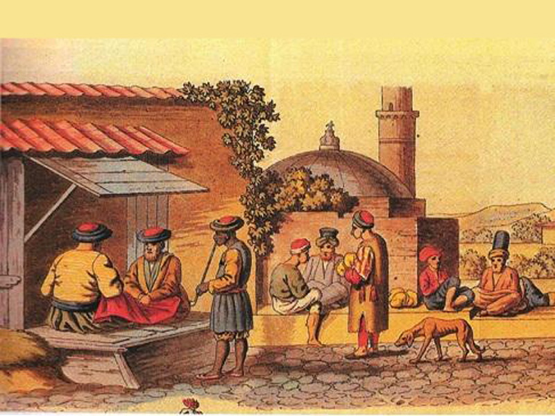 Παζάρι της Λάρισας. Επιχρωματισμένη χαλκογραφία. Σχέδιο Gropius, χάραξη Jugel. Εθνική Βιβλιοθήκη.
