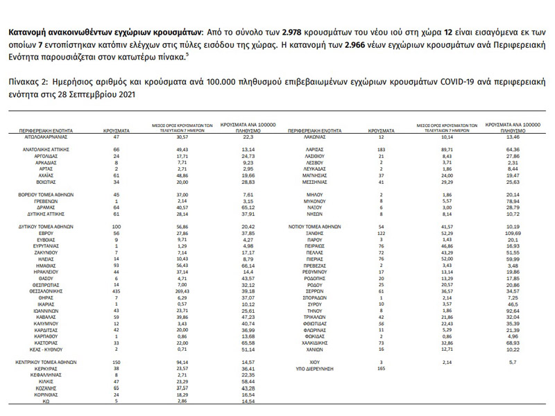 Όπως αναφέρει η σχετική ανακοίνωση, «τα νέα εργαστηριακά επιβεβαιωμένα κρούσματα της νόσου που καταγράφηκαν τις τελευταίες 24 ώρες είναι 2.978, εκ των οποίων 7 εντοπίστηκαν κατόπιν ελέγχων στις πύλες εισόδου της χώρας. Ο συνολικός αριθμός των κρουσμάτων ανέρχεται σε 651.378 (ημερήσια μεταβολή +0.5%), εκ των οποίων 50.9% άνδρες. Με βάση τα επιβεβαιωμένα κρούσματα των τελευταίων 7 ημερών, 86 θεωρούνται σχετιζόμενα με ταξίδι από το εξωτερικό και 3.223 είναι σχετιζόμενα με ήδη γνωστό κρούσμα.