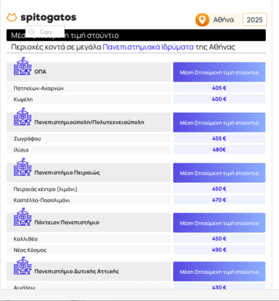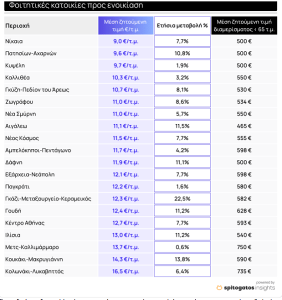 Ενδεικτικά, στην περιοχή του Ζωγράφου, την πλέον φοιτητική περιοχή της Αθήνας λόγω της εγγύτητάς της στην Πανεπιστημιούπολη και την Πολυτεχνειούπολη, ένα φοιτητικό σπίτι μικρότερο των 65 τ.μ. έχει μέση ζητούμενη τιμή ενοικίασης.