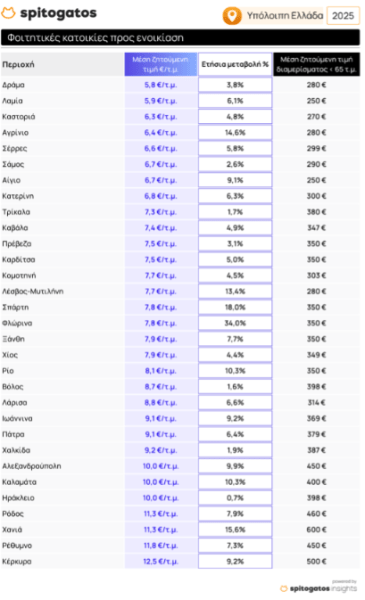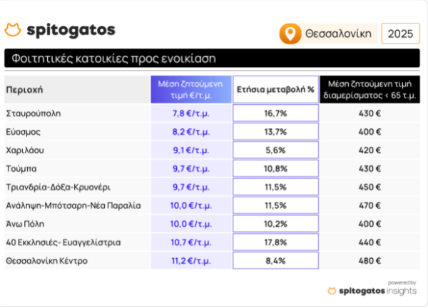 Ειδικότερα σύμφωνα με τη Spitogatos , ελληνική κτηματαγορά κατά το 2ο τρίμηνο του 2025 κατέγραψε αύξηση στα ζητούμενα ενοίκια σε όλη την επικράτεια της τάξης του 7,2%. Την ίδια χρονική περίοδο, η μέση ζητούμενη τιμή (MZT) φοιτητικής κατοικίας προς ενοικίαση σημείωσε ανάλογη αύξηση της τάξης του 7,4% σε όλη την επικράτεια.