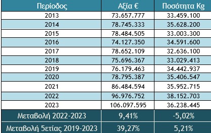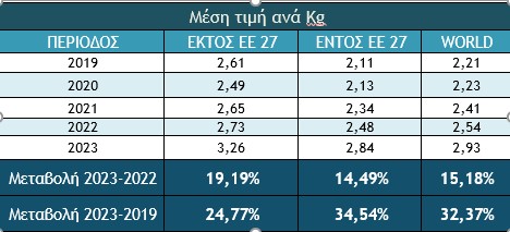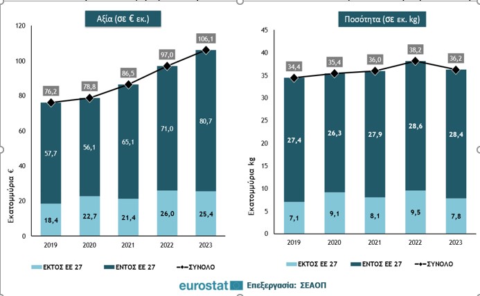 Ειδικότερα, οι εξαγωγές εντός ΕΕ-27 το 2023, σε σύγκριση με το 2022, εμφάνισαν αύξηση ≈22% σε αξία και μείωση -1,5% σε ποσότητα. Όσον αφορά τις Τρίτες Χώρες εμφανίζεται αύξηση σε αξία ≈15% και πτώση σε ποσότητα ≈ -13%.