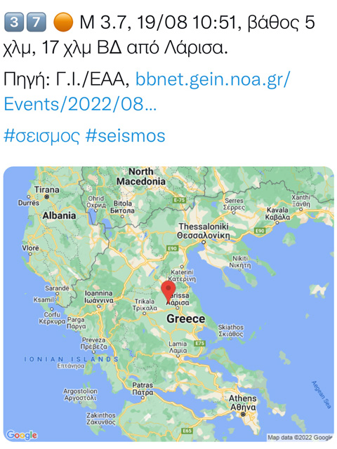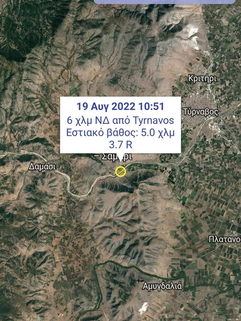 Σεισμική δόνηση 3,7 ρίχτερ ταρακούνησε τη περιοχή μας πριν από λίγα λεπτά. Ο σεισμός είχε επίκεντρο 17 χμ ΒΔ της Λάρισας και εστιακό βάθος 5 χλμ.
