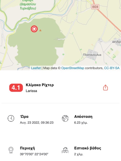 4️⃣3️⃣ M 4.3, 23/08 09:36, βάθος 5 χλμ, 18 χλμ ΒΔ από Λάρισα.