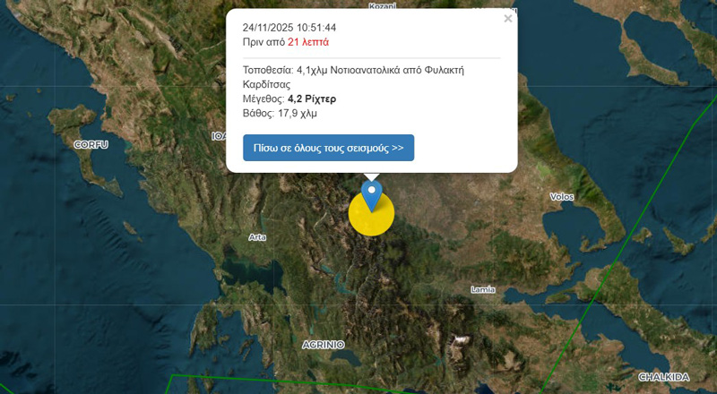 Σεισμική δόνηση μεγέθους 4,2 Ρίχτερ σημειώθηκε στις 10:51 το πρωί της Δευτέρας (24/11) με επίκεντρο την περιοχή της λίμνης Πλαστήρα, προκαλώντας ανησυχία στους κατοίκους.