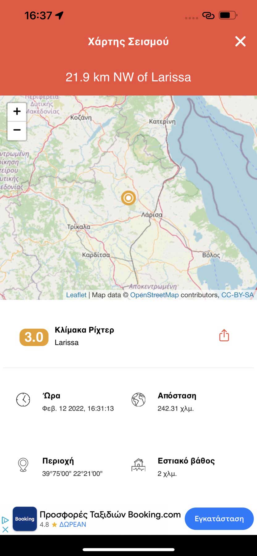 Ο σεισμός συνέβη 21.9 χμ ΒΔ της Λάρισας με εστιακό βάθος 2 χλμ.