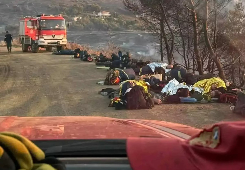 Συγκλονιστική φωτογραφία με εξαντλημένους πυροσβέστες ξαπλωμένους στο χώμα για να ξεκουραστούν
