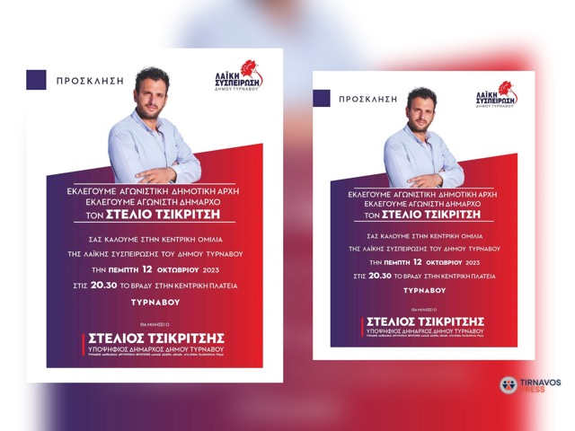Σήμερα το βράδυ Πέμπτη 12 Οκτωβρίου στις 8:30 μ.μ θα γίνει η κεντρική ομιλία του υποψήφιου δημάρχου με τη ΛΑΣΥ Τυρνάβου Στέλιου Τσικριτσή.
