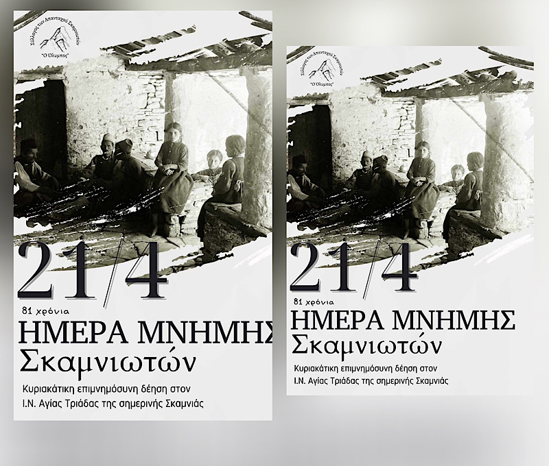 Ο Σύλλογος των Απανταχού αποδήμων Σκαμνιωτών «ο Όλυμπος» διοργανώνει εκδήλωση Μνήμης, με αφορμή τη συμπλήρωση ογδόντα ενός χρόνων από την Ημέρα της ολοσχερούς καταστροφής του χωριού από τους Γερμανούς κατακτητές-με το κάψιμο όλων των σπιτιών (20 Απριλίου 1943) και μοναδικό σωσμένο κτίσμα την εκκλησία της Αγίας Τριάδος της Παλιάς Σκαμνιάς, μνημείο ιστορικής, θρησκευτικής και πολιτιστικής κληρονομιάς σήμερα, σε μια περιοχή φυσικού κάλλους κάτω από τον Όλυμπο.