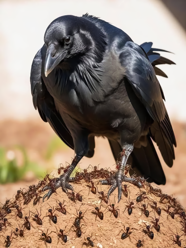 Ακριβώς όπως ακούγεται. Το κοράκι κουρνιάζει σκόπιμα κοντά σε μια φωλιά μυρμηγκιών, απλώνει τα φτερά του και μένει ακίνητο, επιτρέποντας στα μυρμήγκια να “επιτεθούν” στο σώμα του. Όχι από αφέλεια, αλλά από ένστικτο επιβίωσης.