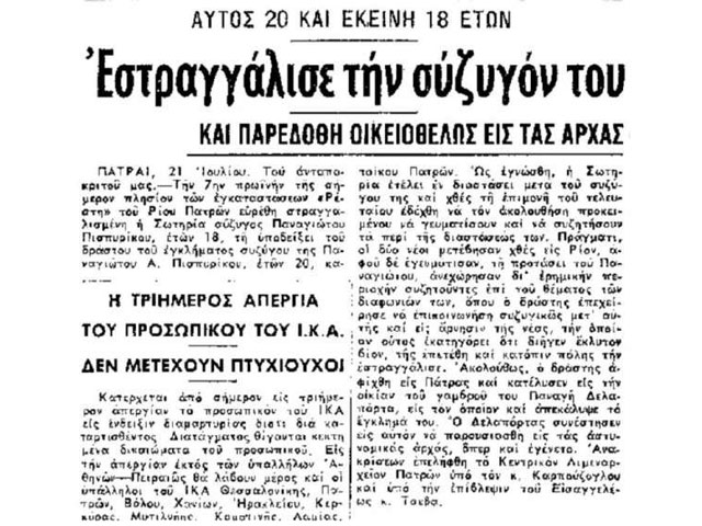 Η απαίτηση της Σωτηρία για διαζύγιο και η απόφασή της να φύγει κάνει έξαλλο τον Παναγιώτη, με συνέπεια να αρχίσει να γίνεται εμμονικός, να την ακολουθεί παντού και να την ενοχλεί, επειδή πιστεύει ότι βλέπει άλλους άνδρες. Το διαζύγιο βγαίνει, αλλά την επιμέλεια του παιδιού την παίρνει ο άντρας. Μόλις δύο ημέρες μετά την τελευταία δικαστική αντιδικία τους, με εκατέρωθεν μηνύσεις για μοιχεία και συκοφαντική δυσφήμηση, ο Παναγιώτης ζητά, την Τετάρτη 21 Ιουλίου 1965, από τη Σωτηρία να πάνε κάπου για να μιλήσουν, σε μια νέα προσπάθεια επανασύνδεσης.