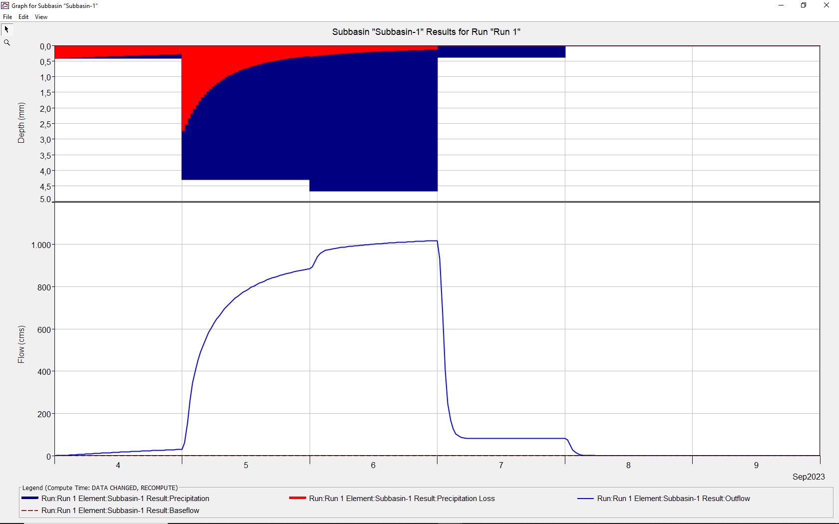 Επιπλέον, αρχικά, στην παρακάτω εικόνα απεικονίζεται το, “προσομοιωμένο ρεαλιστικό”, «ιστόγραμμα βροχόπτωσης» του χρονικού διαστήματος, “04/09-07/09/2023” (“466,00 mm”), (το οποίο και «απέδωσε» την, “προσομοιωμένη ρεαλιστική”, παροχή αιχμής νερού και συγκεκριμένα «1.018,00 κυβικά μέτρα ανά δευτερόλεπτο» ή αλλιώς «1.018,00 m3/sec»), [το οποίο και «απέδωσε», λόγω του ακραίου μετεωρολογικού φαινομένου με την κωδική ονομασία «Daniel», την, “προσομοιωμένη ρεαλιστική”, συνολική ποσότητα νερού, συγκεκριμένα, «159.637.300 κυβικά μέτρα (τόννους νερού)» ή αλλιώς «159.637.300 m3 (τόννους νερού)»], και το αντίστοιχο, “προσομοιωμένορεαλιστικό”, «υδρογράφημα πλημμύρας» που προκύπτει από το συγκεκριμένο, “προσομοιωμένο ρεαλιστικό”, επεισόδιο βροχόπτωσης, (λόγω του ακραίου μετεωρολογικού φαινομένου με την κωδική ονομασία «Daniel»), (η ανάλυση και οι υπολογισμοί έγιναν με το ελεύθερο στο διαδίκτυο λογισμικό «HEC–HMS» του «U.S.A. Army Corps of Engineers» δηλαδή του «Σώματος Μηχανικών του Στρατού των Η.Π.Α.»)[1,2,4,5,6.1,6.2].