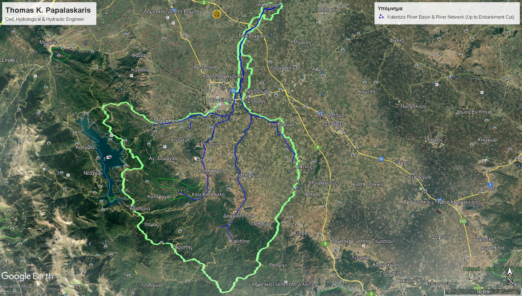 Το υδρογραφικό δίκτυο του «”Ποταμού Καλέντζη”,έως την θέση του προστατευτικού αναχώματος στο οποίο έγινε η τομή, στο ύψος του οικισμού “Κοσκινάς Καρδίτσας”, “Δήμου Παλαμά”, “Νομού καρδίτσας”», στο σημείο που βγαίνει από την συγκεκριμένη υποδιαίρεση της συνολικής υδρολογικής λεκάνης του,είναι, στο σύνολό του, ένα ρέμα «4ης Τάξης», (κατά την μέθοδο “Strahler” κατάταξης των ρεμάτων), με συνολικό μήκος ρεμάτων «1ης Τάξης», «L1STR=136.600,00 μ.μ.» («42 ρέματα») («ως επί το πλείστον, ορεινά πηγαία ρέματα, απομακρυσμένα από την θάλασσα»), με συνολικό μήκος ρεμάτων «2ηςΤάξης», «L2STR=48.077,30 μ.μ.», («20 ρέματα») («ως επί το πλείστον, ορεινά και ημιορεινά ρέματα, απομακρυσμένα από την θάλασσα»), με συνολικό μήκος ρεμάτων «3ης Τάξης», «L3STR=57.474,30 μ.μ.»(«17 ρέματα») («ως επί το πλείστον, ημιορεινάρέματα, απομακρυσμένα από την θάλασσα») και με συνολικό μήκος ρεμάτων «4ης Τάξης», «L4STR=19.273,50μ.μ.» («2 ρέματα») («ως επί το πλείστον, ημιπεδινά ρέματα, απομακρυσμένα από την θάλασσα»), δηλαδή με συνολικό μήκος ρεμάτων, («Ανεξάρτητα Τάξης»), ίσο με «LTOTAL=261.425,10 μ.μ.» (ή αλλιώς «L(1+2+3+4)TOTAL=261,425 χιλιόμετρα») («81 ρέματα»). Το συνολικό εμβαδόν της «λεκάνης απορροής» του «”Ποταμού Καλέντζη”, έως την θέση της τομής του αναχώματος, στο ύψος του οικισμού “Κοσκινάς Καρδίτσας”, “Δήμου Παλαμά”, “Νομού Καρδίτσας”»είναι ίσο με «404.809,42 στρέμματα» [(«404,81τετραγωνικά χιλιόμετρα» (km2)] (ενώ, ειδικότερα, καταλαμβάνει: το «0,67%» [«2,70» («“τετραγωνικά χιλιόμετρα” “(km2)”»)] του εμβαδού της επιφάνειας του «Δήμου Παλαμά», το «81,98%» [«331,85» («“τετραγωνικά χιλιόμετρα” “(km2)”»)] του εμβαδού της επιφάνειας του «Δήμου Καρδίτσας», το «8,76%»[«35,47» («“τετραγωνικά χιλιόμετρα” “(km2)”»)] του εμβαδού της επιφάνειας του «Δήμου Λίμνης Πλαστήρα») και το «8,60%» [«34,79» («“τετραγωνικά χιλιόμετρα” “(km2)”»)] του εμβαδού της επιφάνειαςτου «Δήμου Σοφάδων» (1,2,4).