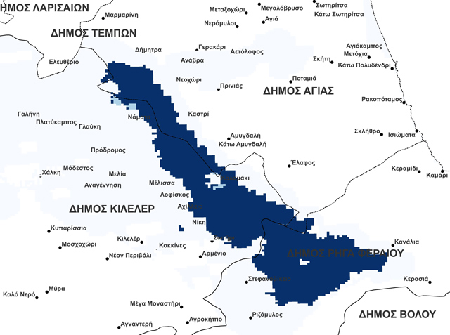 Συγκεκριμένα υπολόγισε ότι η συνολική επιφάνεια έχει έκταση ίση με «150.674,56» ήτοι «εκατόν πενήντα χιλιάδες εξακόσια εβδομήντα τέσσερα και 56/100», ενώ αναλυτικότερα η παραπάνω επιφάνεια κατανέμεται ως εξής: 1).περίπου το «40%», (για την ακρίβεια το «39,80%» ή αλλιώς συνολική επιφάνεια ίση με «59.974,65 στρέμματα» ήτοι «πενήντα εννέα χιλιάδες εννιακόσια εβδομήντα τέσσερα και 65/100 στρέμματα»), καταλαμβάνεται από τον «Δήμο Ρήγα Φεραίου» του «Νομού Βόλου», 2).περίπου το «19%», (για την ακρίβεια το «18,70%» ή αλλιώς συνολική επιφάνεια ίση με «28.176,01 στρέμματα» ήτοι «είκοσι οκτώ χιλιάδες εκατόν εβδομήντα έξι και 01/100 στρέμματα»), καταλαμβάνεται από τον «Δήμο Αγιάς» του «Νομού Λάρισας» και 3).περίπου το «42%», (για την ακρίβεια το «41,50%» ή αλλιώς συνολική επιφάνεια ίση με «62.523,90 στρέμματα» ήτοι «εξήντα δύο χιλιάδες πεντακόσια είκοσι τρία και 90/100 στρέμματα»), καταλαμβάνεται από τον «Δήμο Κιλελέρ» του «Νομού Λάρισας».