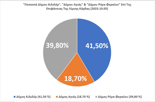 Αξίζει να σημειωθεί ότι σε προηγούμενο άρθρο του, ο Θωμάς Παπαλάσκαρης, είχε υπολογίσει, (και πάλι με την χρήση δορυφορικών δεδομένων), το «ιστορικό “ρεκόρ” έκτασης επιφάνειας της “Λίμνης Κάρλας”», το απόγευμα της “Παρασκευής 15/09/2023”, σε «172.231,44 στρέμματα» ήτοι «εκατόν εβδομήντα δύο χιλιάδες διακόσια τριάντα ένα και 44/100», ενώ αναλυτικότερα η παραπάνω επιφάνεια κατανεμήθηκε ως εξής: 1).το «34%», (για την ακρίβεια το «33,24%» ή αλλιώς συνολική επιφάνεια ίση με «57.246,49 στρέμματα» ήτοι «πενήντα επτά χιλιάδες διακόσια σαράντα έξι και 49/100 στρέμματα»), είχε καταληφθεί από τον «Δήμο Ρήγα Φεραίου» του «Νομού Βόλου», 2).το «24%», (για την ακρίβεια το «23,11%» ή αλλιώς συνολική επιφάνεια ίση με «39.804,20 στρέμματα» ήτοι «τριάντα εννέα χιλιάδες οκτακόσια μηδέν τέσσερα και 20/100 στρέμματα»), είχε καταληφθεί από τον «Δήμο Αγιάς» του «Νομού Λάρισας» και 3).το «44%», (για την ακρίβεια το «43,65%» ή αλλιώς συνολική επιφάνεια ίση με «75.180,75 στρέμματα» ήτοι «εβδομήντα πέντε χιλιάδες εκατόν ογδόντα και 75/100 στρέμματα»), είχε καταληφθεί από τον «Δήμο Κιλελέρ» του «Νομού Λάρισας».