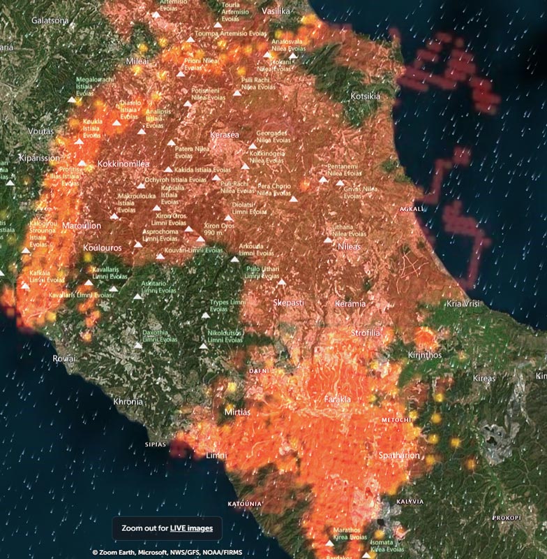 Συγκεκριμένα, όπως εκτιμά, η έως τώρα καμένη έκταση στην περιοχή της Αττικής ανέρχεται σε 7.615 εκτάρια και η καμένη έκταση στην Εύβοια είναι 19.794 εκτάρια (αρκετά χαμηλότερη της προηγούμενης εκτίμησης για περίπου 35.000 εκτάρια). Με δεδομένο ότι ένα εκτάριο ισούται με δέκα στρέμματα, οι καμένες εκτάσεις είναι 76.150 και 197.940 στρέμματα αντίστοιχα.