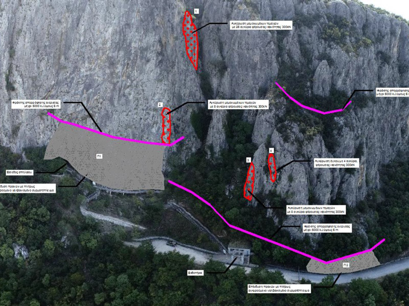 - Αγκυρώσεις μεμονωμένων τεμαχίων στα εξωτερικά πρανή πρόσβασης και παρειών του σπηλαίου