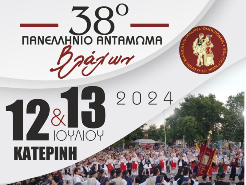 Η Πανελλήνια Ομοσπονδία Πολιτιστικών Συλλόγων Βλάχων διοργανώνει το 38ο Πανελλήνιο Αντάμωμα Βλάχων στις 12 και 13 Ιουλίου 2024, στην Κατερίνη υπό την αιγίδα της Περιφέρειας Κεντρικής Μακεδονίας με συνδιοργανωτές την Περιφερειακή Ενότητα Πιερίας και το Δήμο Κατερίνης, και τους συλλόγους: