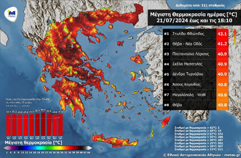 Ο πίνακας που ακολουθεί παρουσιάζει τις 8 υψηλότερες θερμοκρασίες που καταγράφησαν από το δίκτυο των σταθμών του meteo.gr / Εθνικού Αστεροσκοπείου Αθηνών.