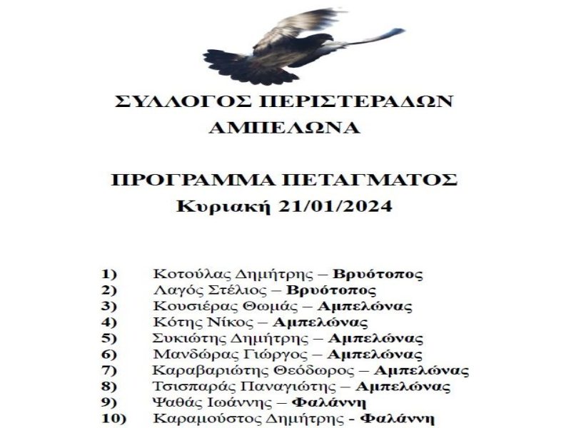 Οι λάτρεις των περιστεριών από όλη την Ελλάδα θα συγκεντρωθούν την Κυριακή 21/01/2024 στον Αμπελώνα στην ετήσια συνάντηση που πραγματοποιούν τα μέλη του Συλλόγου Περιστεράδων Αμπελώνα ο οποίος διαθέτει πάνω από 100 περιστεράδες.