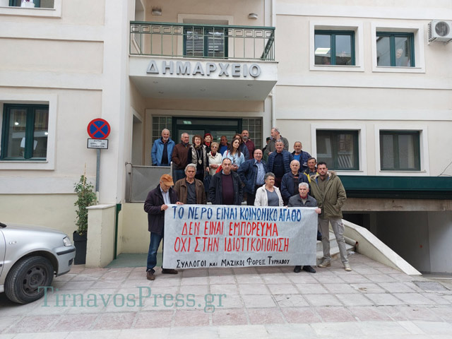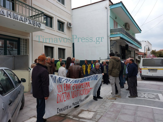 Συγκέντρωση διαμαρτυρίας πραγματοποίησαν σήμερα Τετάρτη 22 Μαρτίου έξω από την ΔΕΥΑ Τυρνάβου μέλη του Αγροτικού Συλλόγου Τυρνάβου, μέλη του συλλόγου συνταξιούχων ΟΑΕΕ, δημοτικοί σύμβουλοι της δημοτικής παράταξης Λαϊκή Συσπείρωση Τυρνάβου αλλά και εργαζόμενοι της ΔΕΥΑΤ, διαμαρτυρόμενοι για το νομοσχέδιο της κυβέρνησης που αφορά το νερό.