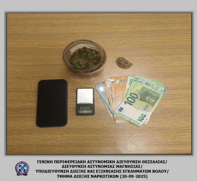 Συνελήφθησαν, χθες (19-09-2025) το απόγευμα στον Βόλο, από αστυνομικούς του Τμήματος Δίωξης Ναρκωτικών της Υποδιεύθυνσης Δίωξης και Εξιχνίασης Εγκλημάτων Βόλου, -2- άτομα, από τα οποία -1- ημεδαπός άνδρας και -1- αλλοδαπή γυναίκα, σε βάρος των οποίων σχηματίστηκε δικογραφία για παράβαση της νομοθεσίας περί ναρκωτικών.