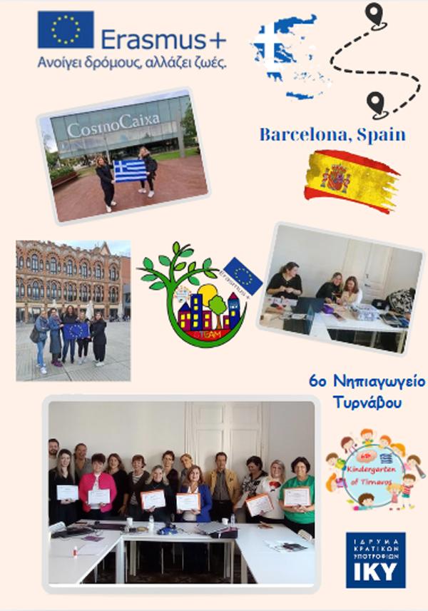 Η εκπαιδευτικός Τσιτσιρίγγου Αργυρή του 6ου Νηπιαγωγείου Τυρνάβου παρακολούθησε το επιμορφωτικό σεμινάριο με τίτλο: “Από το STEM στο STEAM Education: μια νέα προσέγγιση μάθησης” από 18 έως 24 Νοεμβρίου. Το σεμινάριο πραγματοποιήθηκε στη Βαρκελώνη της Ισπανίας, από τη Europass Teacher Academy.