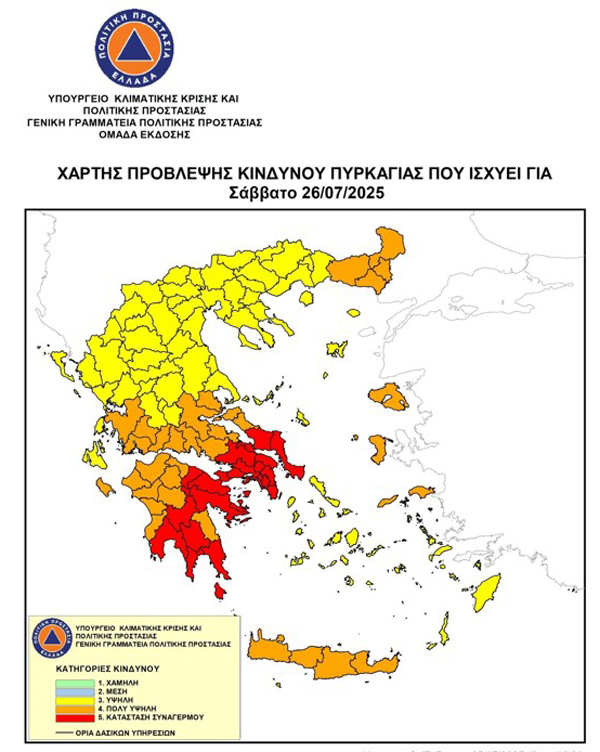 Σε κατάσταση αυξημένης ετοιμότητας τίθενται οι αρμόδιες αρχές για το Σάββατο 26 Ιουλίου 2025, σύμφωνα με τον Χάρτη Πρόβλεψης Κινδύνου Πυρκαγιάς που εκδόθηκε από την Πολιτική Προστασία την Παρασκευή 25 Ιουλίου.