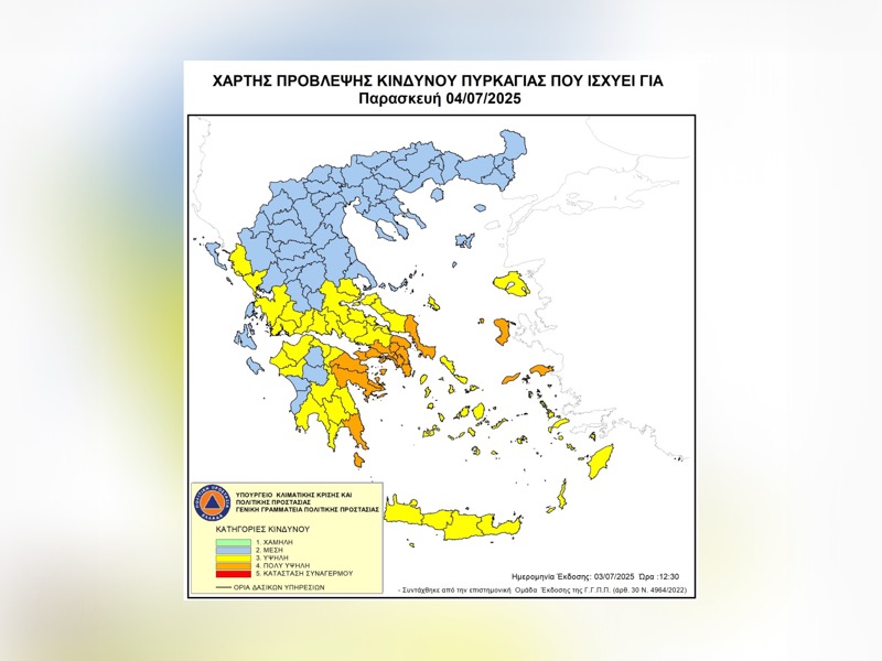 Η Αυτοτελής Διεύθυνση Πολιτικής Προστασίας της Περιφέρειας Θεσσαλίας ενημερώνει ότι για την Παρασκευή 4 Ιουλίου 2025, ο Χάρτης Πρόβλεψης Κινδύνου Πυρκαγιάς της Γενικής Γραμματείας Πολιτικής Προστασίας προβλέπει Κατηγορία 3 (υψηλή) για περιοχές της Π.Ε. Μαγνησίας.