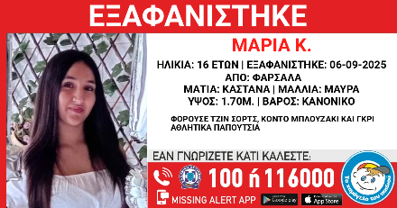 Στις 06/09/2025, μεσημεριανές ώρες, εξαφανίστηκε από τα Φάρσαλα, η Μαρία Κ. 16 ετών.
