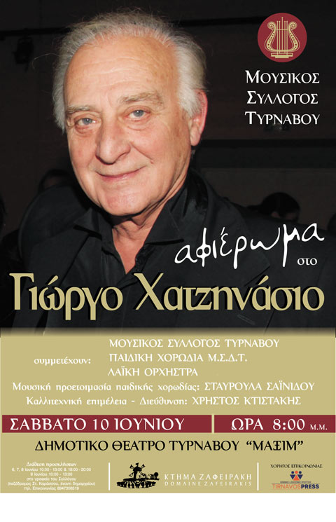 Ο Μουσικός Σύλλογος Τυρνάβου σας προσκαλεί το Σάββατο 10 Ιουνίου στις 20:00 στο Δημοτικό Θέατρο Τυρνάβου σε μια συναυλία – αφιέρωμα σε έναν απ’ τους μεγαλύτερους Έλληνες συνθέτες, το Γιώργο Χατζηνάσιο!