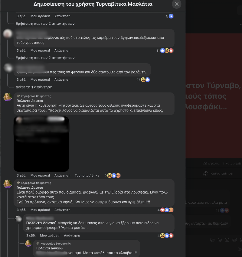Πρίν 3 εβδομάδες περίπου, μέσα από γνωστή σελίδα για το ύφος και την κατεύθυνση, είχαν δημοσιευτεί αυτές οι προσβλητικές αναρτήσεις, τις οποίες είχαμε αναδείξει και καταγγείλει δημόσια με άρθρο μας «Η Ντροπή του Τυρνάβου Έχει Όνομα»: Τυρναβίτικα Μασλάτια.