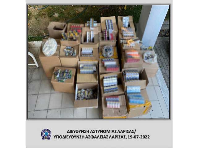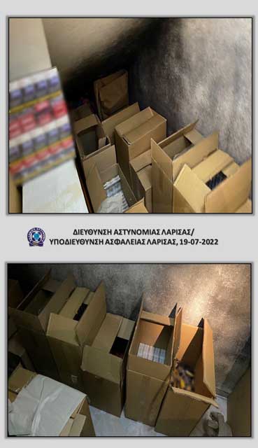 Επιπρόσθετα, σε νομότυπη έρευνα που διενεργήθηκε στην οικία του δράστη, σε περιοχή του Τυρνάβου, βρέθηκαν σε ειδικά διαμορφωμένη κρύπτη και κατασχέθηκαν -5.620- πακέτα τσιγάρων και -755- συσκευασίες καπνού, των -50- γραμμαρίων η καθεμία, χωρίς την ειδική ένσημη ταινία φορολόγησης.