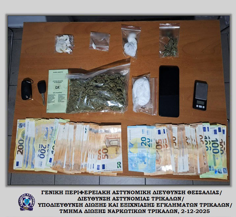 Συνελήφθησαν, χθες (1-12-2025) στα Τρίκαλα, από αστυνομικούς του Τμήματος Δίωξης Ναρκωτικών της Υποδιεύθυνσης Δίωξης και Εξιχνίασης Εγκλημάτων Τρικάλων, -2- ημεδαποί άνδρες, σε βάρος του οποίων σχηματίστηκε δικογραφία για –κατά περίπτωση- παραβάσεις της νομοθεσίας περί ναρκωτικών.