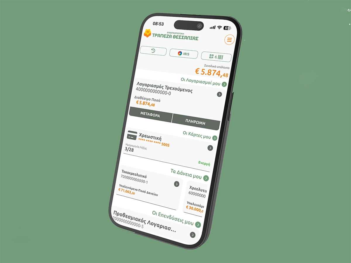 H εφαρμογή ThessalyBank παρέχει γρήγορη και ασφαλή πρόσβαση μέσω 4ψήφιου PIN ή βιομετρικών στοιχείων της συσκευής. Στην αρχική σελίδα οι πελάτες έχουν ολοκληρωμένη εικόνα των λογαριασμών, των δανείων, των καρτών και των προθεσμιακών καταθέσεών , ενώ μπορούν να πραγματοποιούν άμεσες συναλλαγές, όπως πληρωμές και μεταφορές κεφαλαίου, χρησιμοποιώντας παράλληλα QR Code ή Barcode για γρήγορη πληρωμή λογαριασμών. Όλες οι κινήσεις και οι σημαντικές πληροφορίες συγκεντρώνονται στην αρχική οθόνη, εξασφαλίζοντας ένα φιλικό και εύχρηστο περιβάλλον για τον χρήστη.