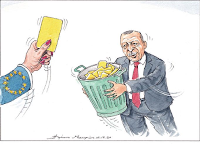 Οι αποφάσεις της συνόδου κορυφής απέχουν λοιπόν παρασάγγας από αυτά που ζητούσε η Αθήνα επί μήνες. Και ένα βήμα κάθε τρίμηνο δεν κάνει τον Ερντογάν πειθήνιο… Ο πρωθυπουργός Κυριάκος Μητσοτάκης στη συνέντευξή του την περασμένη Δευτέρα στον Alpha εξέφραζε την πεποίθησή ότι «η Ευρωπαϊκή Ένωση δεν θα διακινδυνεύσει το δικό της κύρος…το Δεκέμβριο θα πάρουμε αποφάσεις και θα υπάρχουν, θα δρομολογηθούν, οι συνέπειες για την Τουρκία».