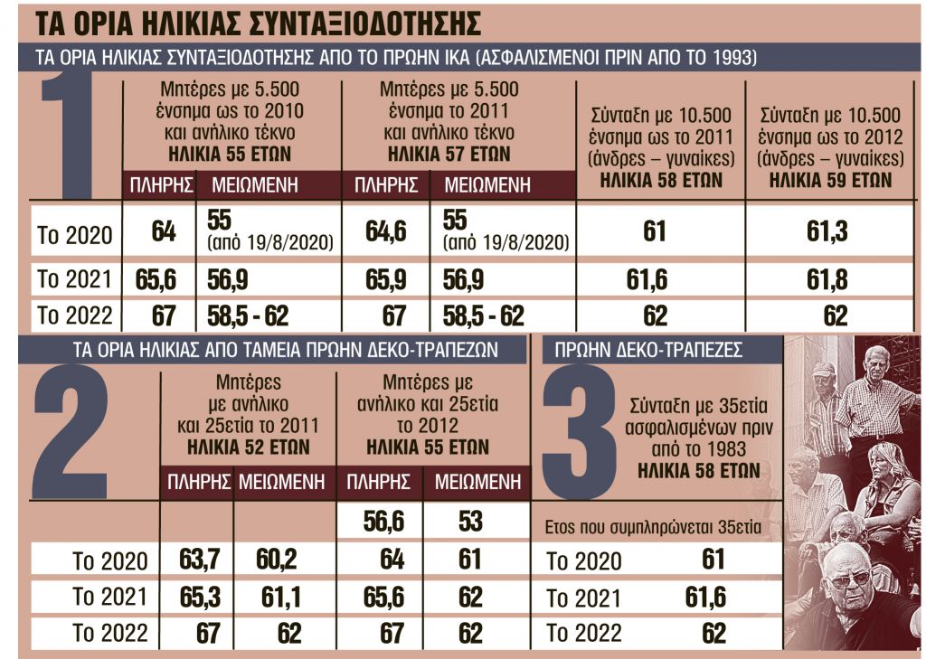 - Στο πρώην ΙΚΑ η έξοδος για σύνταξη προϋποθέτει να έχουν οι παλαιοί ασφαλισμένοι 35 έτη έως το 2012 και οι μητέρες με ανήλικο 5.500 ένσημα έως το 2012 για να κατοχυρώσουν πλήρη ή μειωμένη σύνταξη.