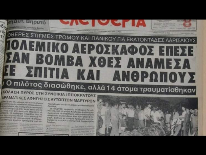 Ό πιλότος κατάφερε να το κατευθύνει στο πάρκο και για λίγα μέτρα γλίτωσαν τα σπίτια μας. Έσωσε ίσως έτσι πολλές ζωές και περιουσίες ενώ τελευταία στιγμή κατάφερε να εκτιναχθεί και έπεσε στα χωράφια έξω από τη Λάρισα και σώθηκε.