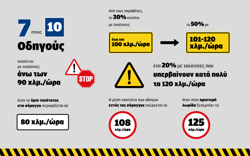 • 7 στους 10 οδηγούς κινούνται με ταχύτητες άνω των 90 χλμ./ώρα, ενώ το όριο είναι 80 χλμ./ώρα.