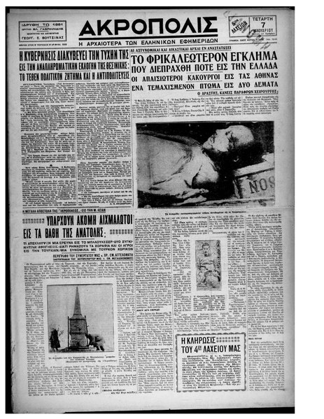 Ο Δ. ΑΘΑΝΑΣΟΠΟΥΛΟΣ ΗΤΑΝ ΤΟ ΘΥΜΑ ΤΟΥ ΠΡΩΤΟΥ ΕΓΚΛΗΜΑΤΟΣ ΠΑΘΟΥΣ ΣΤΗΝ ΕΛΛΑΔΑ, ΣΤΟ ΜΑΚΡΙΝΟ 1931, ΠΟΥ ΑΝΑΠΑΡΑΧΘΗΚΕ ΕΠΙ ΕΒΔΟΜΑΔΕΣ ΚΑΙ ΣΕ ΣΥΝΕΧΕΙΕΣ ΑΠΟ ΤΙΣ ΕΦΗΜΕΡΙΔΕΣ ΤΗΣ ΕΠΟΧΗΣ. ΣΤΗ ΦΩΤΟΓΡΑΦΙΑ ΤΟ ΠΡΩΤΟΣΕΛΙΔΟ ΤΗΣ «ΑΚΡΟΠΟΛΙΣ» (7/1/1931)