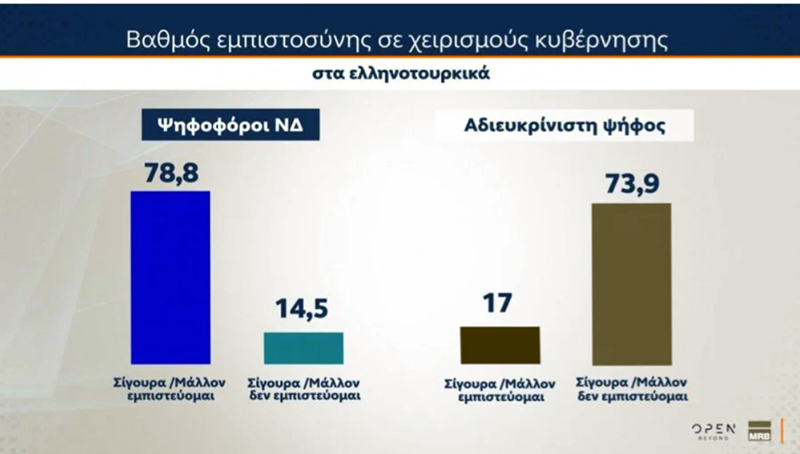 Σε ό,τι αφορά τα ελληνοτουρκικά το 58,6% δεν εμπιστεύεται τους χειρισμούς της κυβέρνησης.
