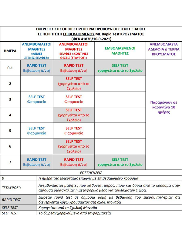 - Εμβολιασμένοι μαθητές και εκπαιδευτικοί ή άτομα με ιστορικό νόσησης το τελευταίο εξάμηνο συνεχίζουν τις δραστηριότητές τους χωρίς να μπουν σε απομόνωση, με την υποχρέωση πραγματοποίησης δύο αυτοδιαγνωστικών έλεγχων (self test) στο διάστημα των 7 ημερών μετά την τελευταία επαφή με το επιβεβαιωμένο κρούσμα.