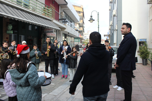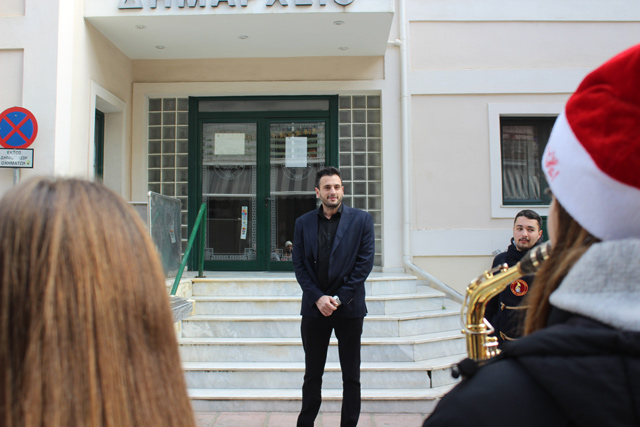 Ο Δήμαρχος έξω από το δημαρχείο έστειλε τις ευχές του και ευχαρίστησε τα παιδιά της Φιλαρμονικής για τα κάλαντα.