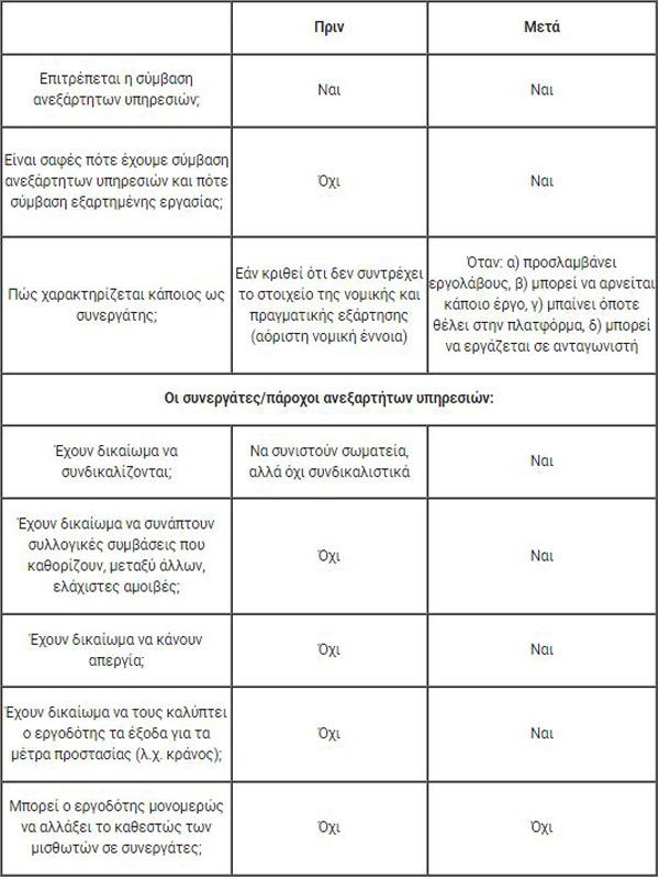 - Σε ορισμένες περιπτώσεις κρινόταν από τα Δικαστήρια ότι η σύμβαση ανεξάρτητων υπηρεσιών υπέκρυπτε σύμβαση εργασίας. Αυτό, όμως, γινόταν βάσει των κριτηρίων που έθετε η γενική θεωρία του εργατικού δικαίου, δηλαδή εξεταζόταν εάν ανάμεσα στον συνεργάτη και την πλατφόρμα υπήρχε πραγματική και νομική εξάρτηση (= ο εργοδότης καθόριζε τον χρόνο, τόπο και τρόπο της εργασίας). Επομένως, υπήρχαν πολλές περιπτώσεις, στις οποίες συνεργάτες εργάζονταν ουσιαστικά με ίδιο καθεστώς με τους μισθωτούς (υπήρχε, δηλαδή, η πραγματική και νομική εξάρτηση από την πλατφόρμα), αλλά δεν μπορούσαν να το τεκμηριώσουν, αφού ο νόμος δεν παρείχε συγκεκριμένα κριτήρια.