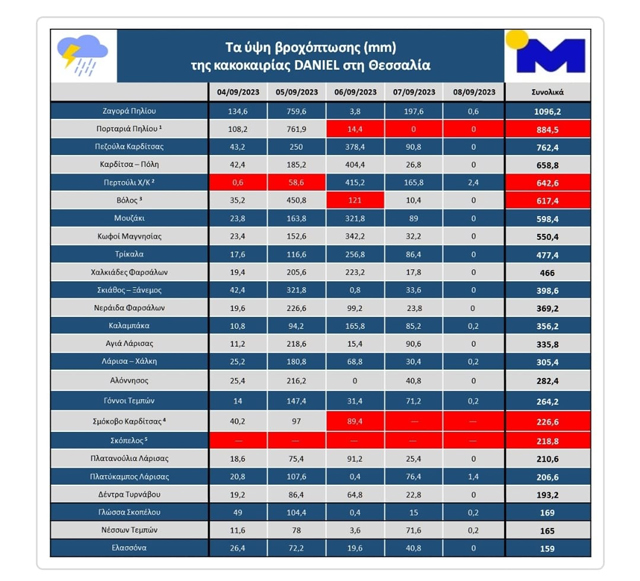 Στον πίνακα που ακολουθεί παρουσιάζονται τα ύψη βροχόπτωσης (ημερήσια και αθροιστικά) της κακοκαιρίας Daniel (04-08/09/2023), σύμφωνα με το δίκτυο αυτόματων μετεωρολογικών σταθμών του meteo.gr/EAA, για το σύνολο της Θεσσαλίας η οποία υπέστη και τις σημαντικότερες καταστροφές.