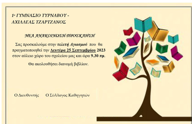 1ο Δημοτικό Σχολείου Τυρνάβου: Αγιασμός τη Δευτέρα 25 Σεπτεμβρίου 2023 στις 9:00