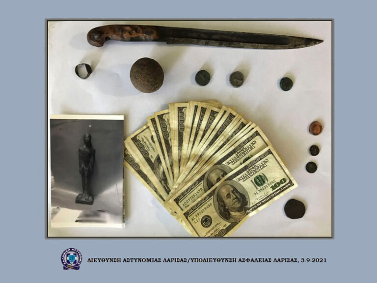 Συνελήφθη ημεδαπός στη Λάρισα, κατηγορούμενος για παράβαση της νομοθεσίας περί αρχαιοτήτων και εν γένει της πολιτιστικής κληρονομιάς και για παράβαση του νόμου περί όπλων