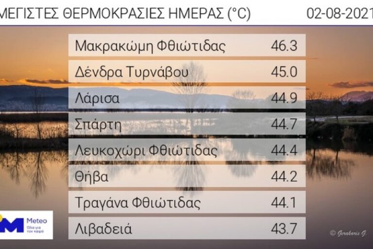 Καύσωνας: Στα Δένδρα Τυρνάβου η δεύτερη υψηλότερη θερμοκρασία στη χώρα για σήμερα 2 Αυγούστου 2021