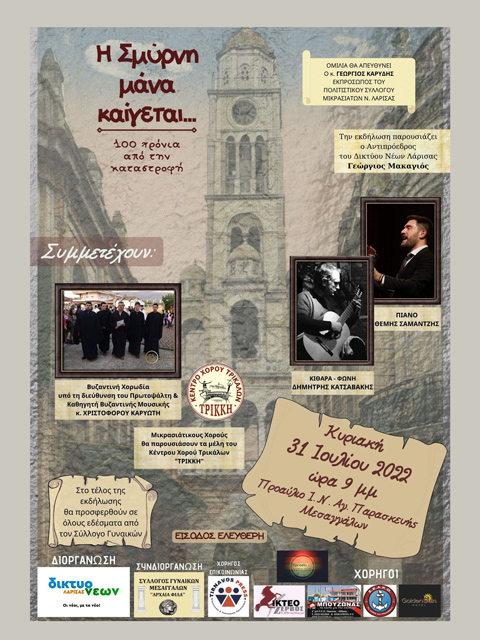 Το Δίκτυο Νέων Λάρισας διοργανώνει την εκδήλωση: Η Σμύρνη μάνα καίγεται – 100 χρόνια από την καταστροφή
