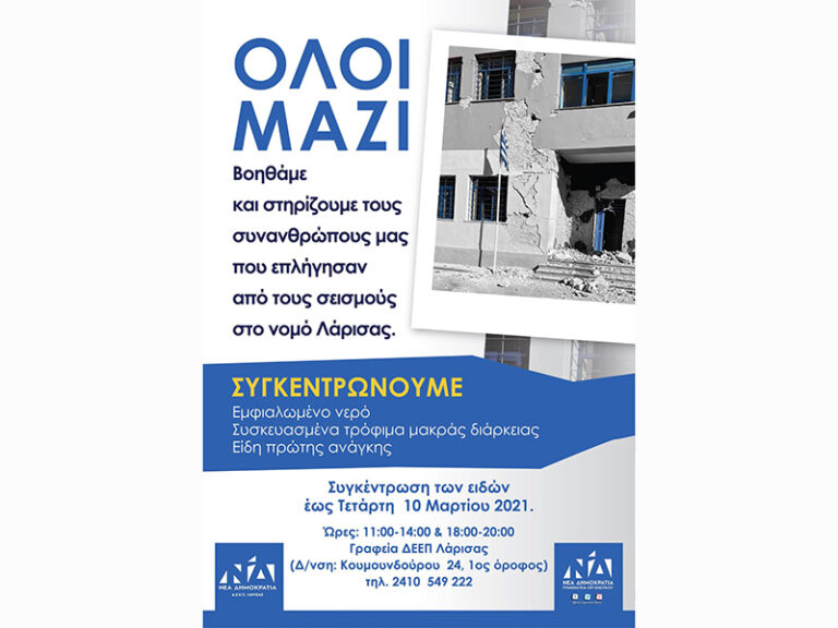 Συγκέντρωση τροφίμων της Γραμματείας Οργανωτικού της ΝΔ, της Δ.Ε.Ε.Π Λάρισας & των 7 ΔΗΜ.Τ.Ο Νομού Λάρισας για τους σεισμοπαθείς