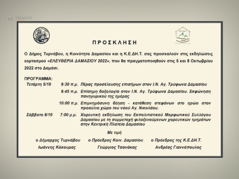 Πρόσκληση για τα “ΕΛΕΥΘΕΡΙΑ” Δαμασίου την Πέμπτη 5 Οκτωμβρίου 2023 στις 9.30π.μ